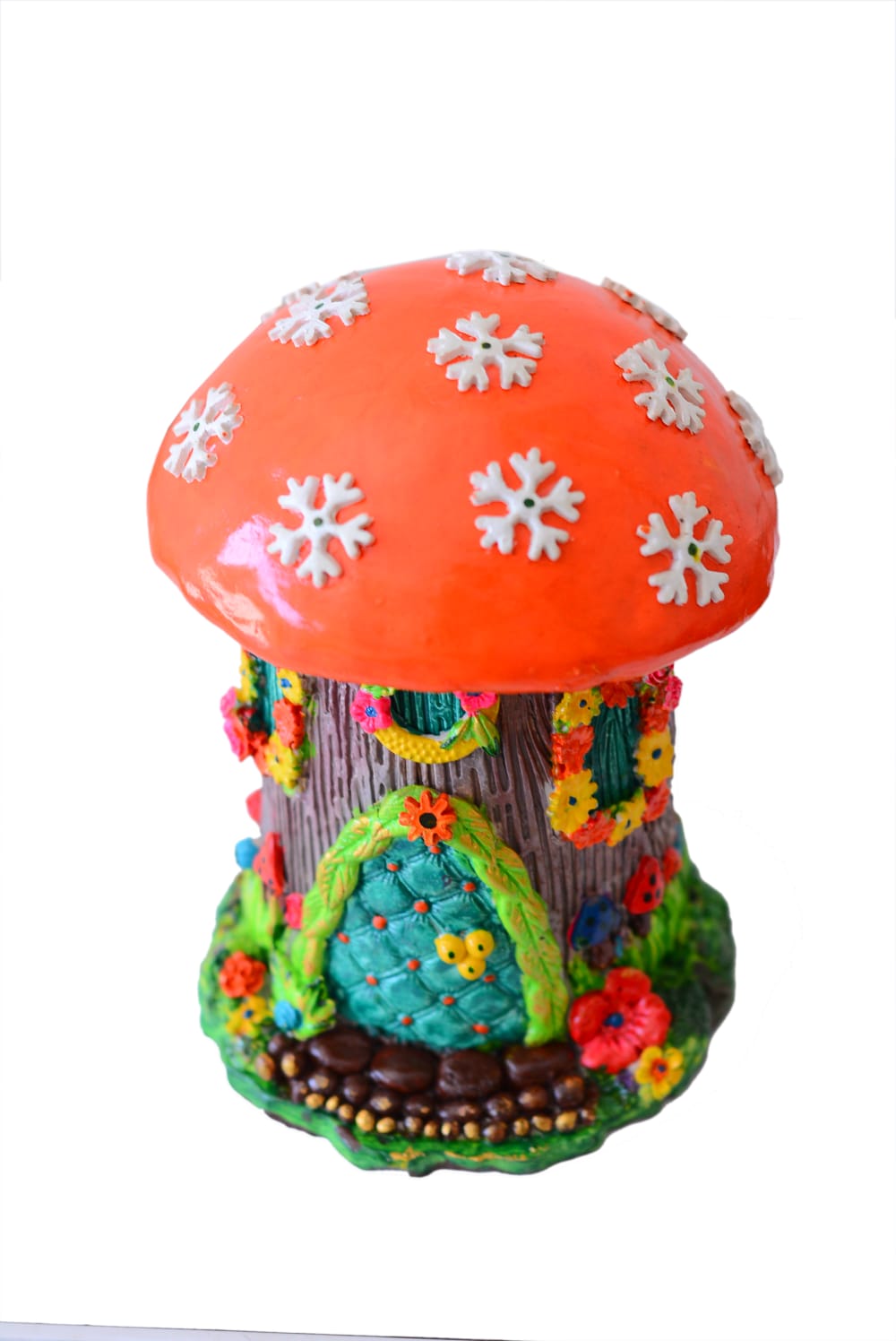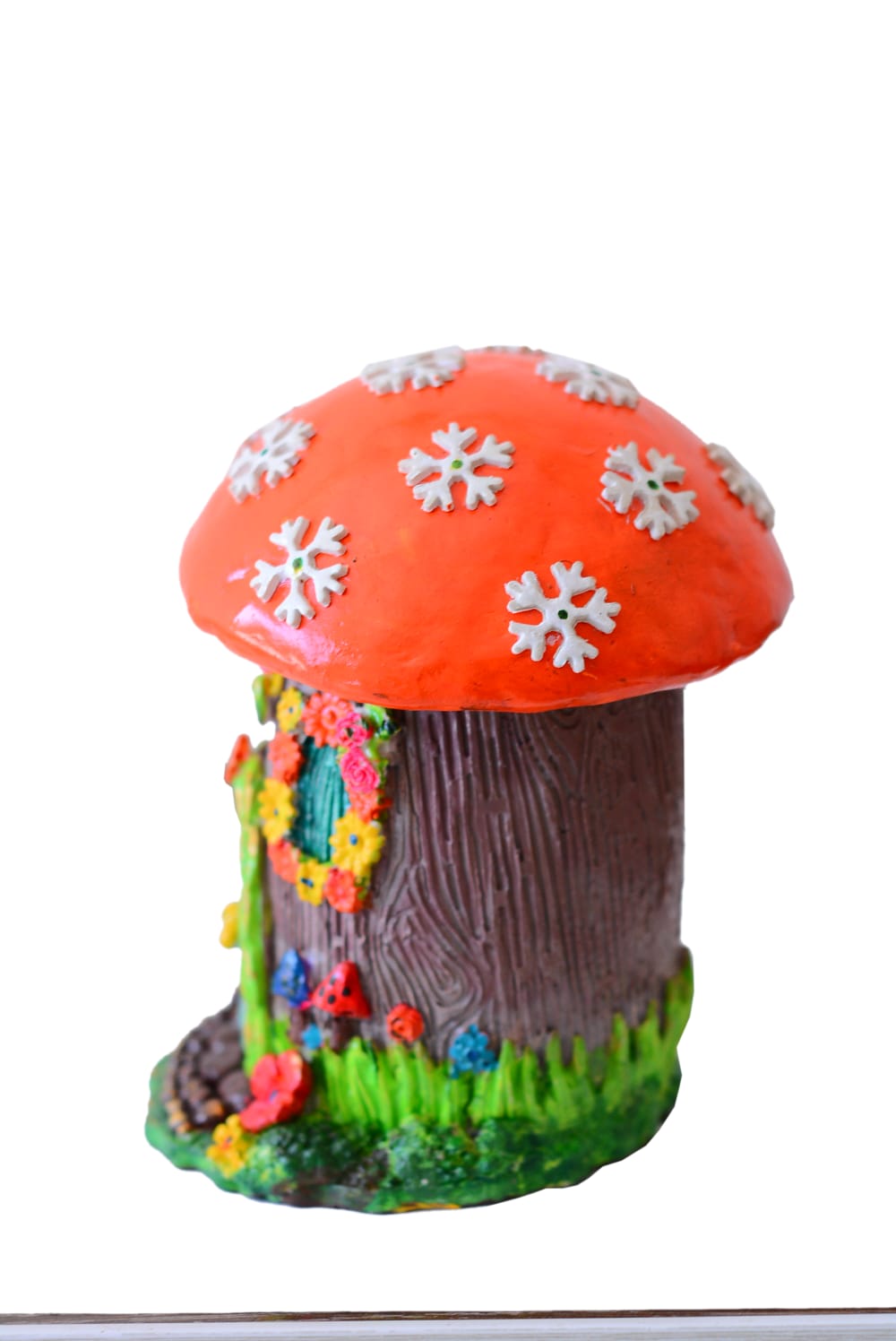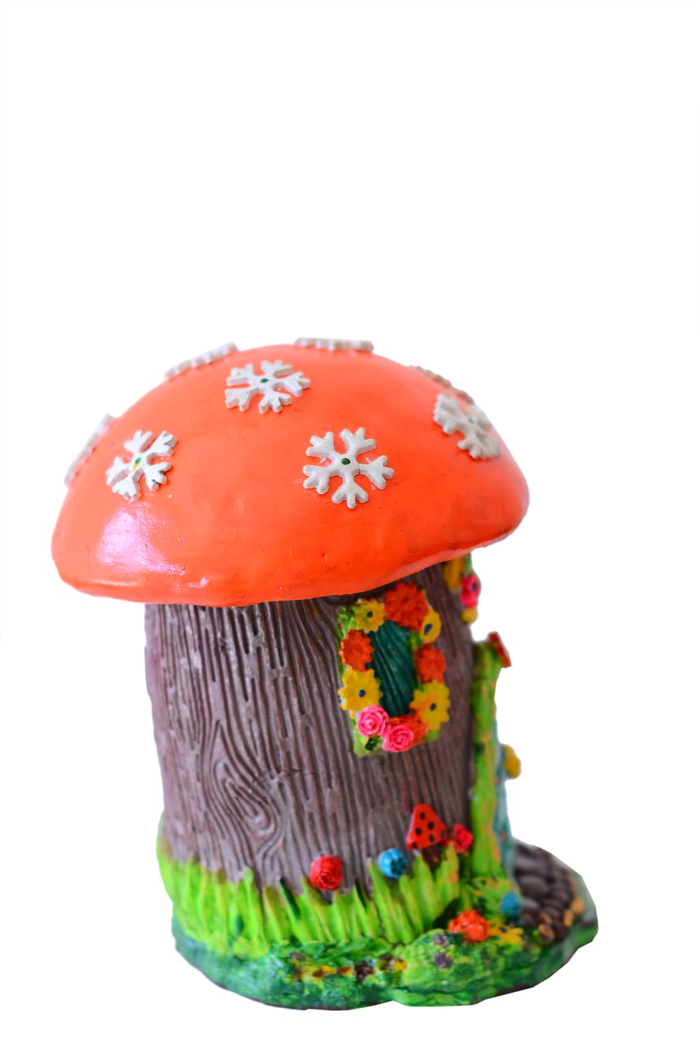 This is a colorful mushroom-shaped fairy house figurine. It features a bright orange cap adorned with white snowflakes, sitting atop a brown, tree-bark textured base.