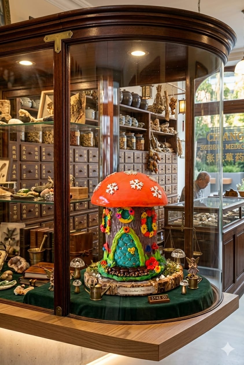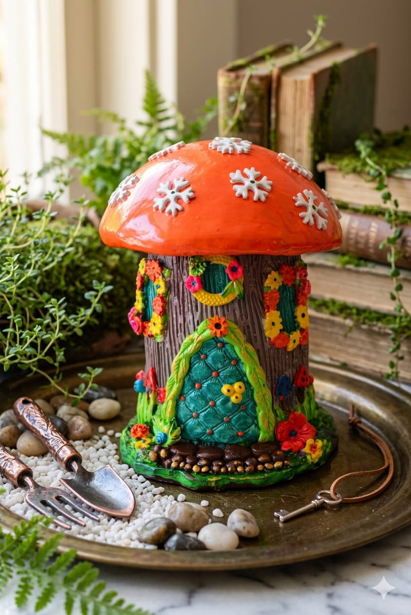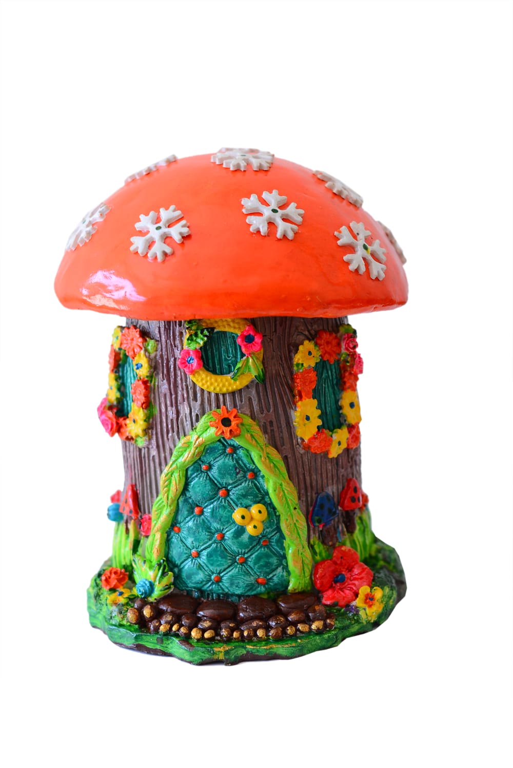 This is a colorful mushroom-shaped fairy house figurine. It features a bright orange cap adorned with white snowflakes, sitting atop a brown, tree-bark textured base.