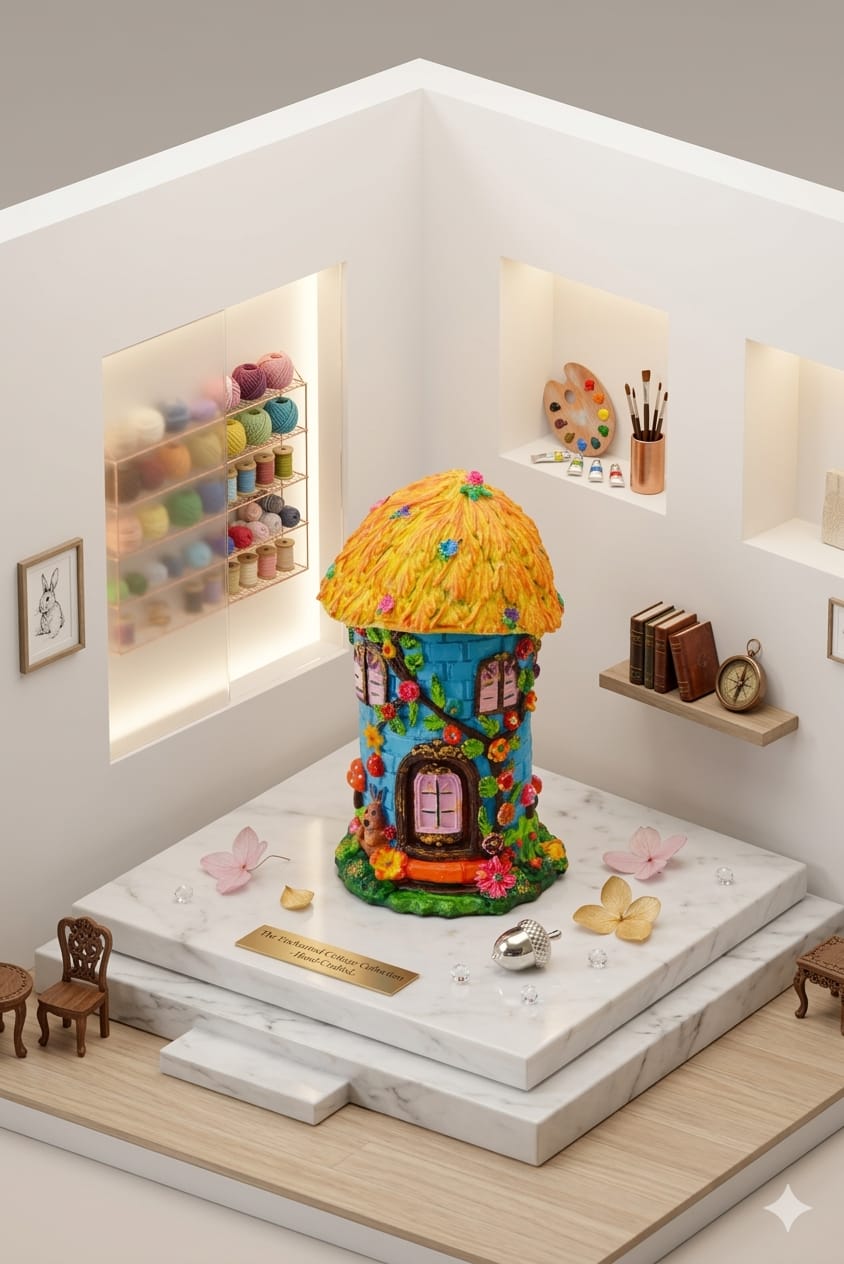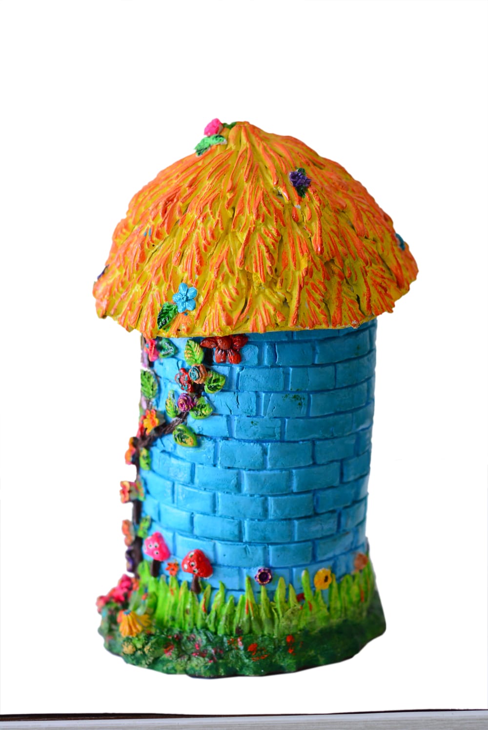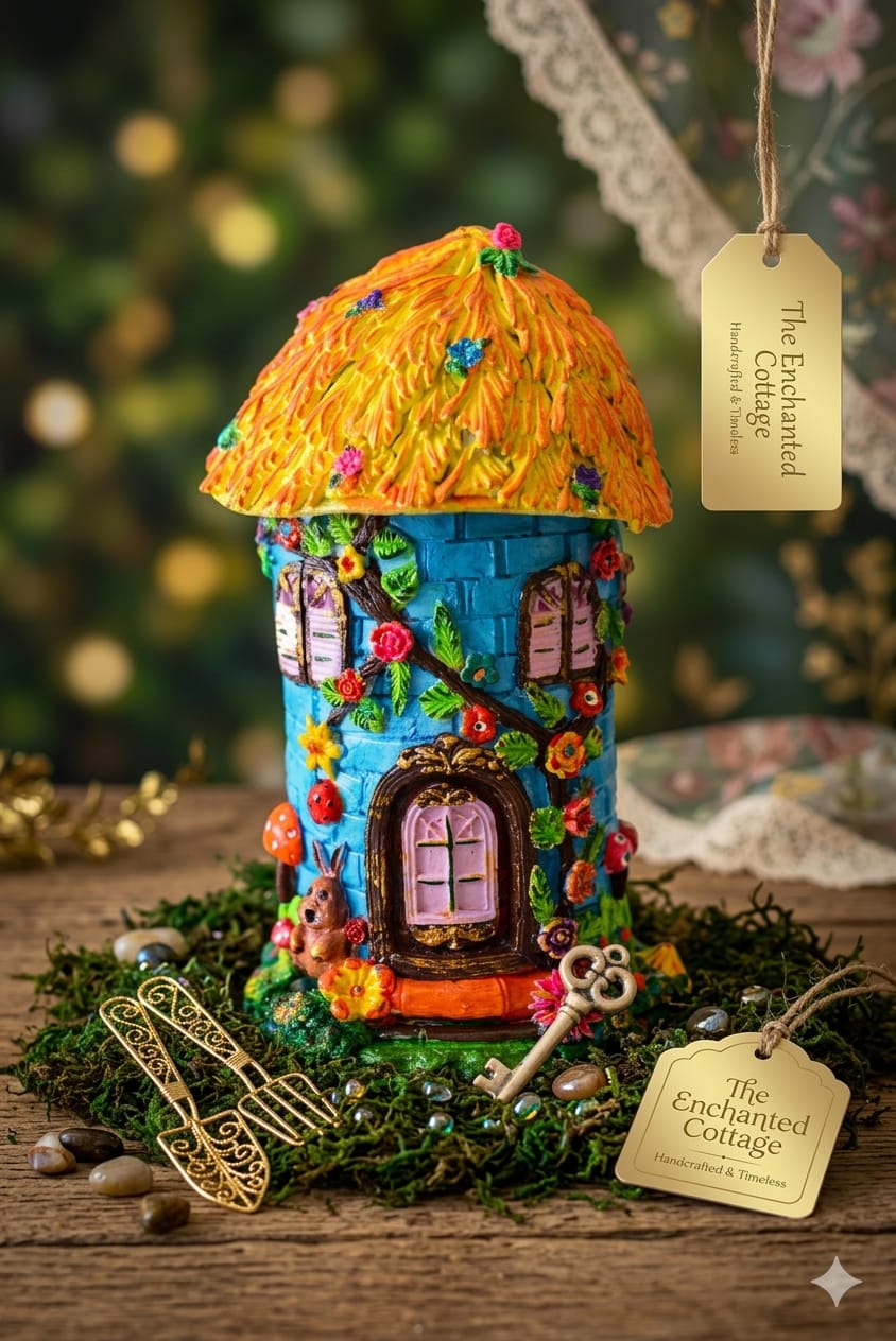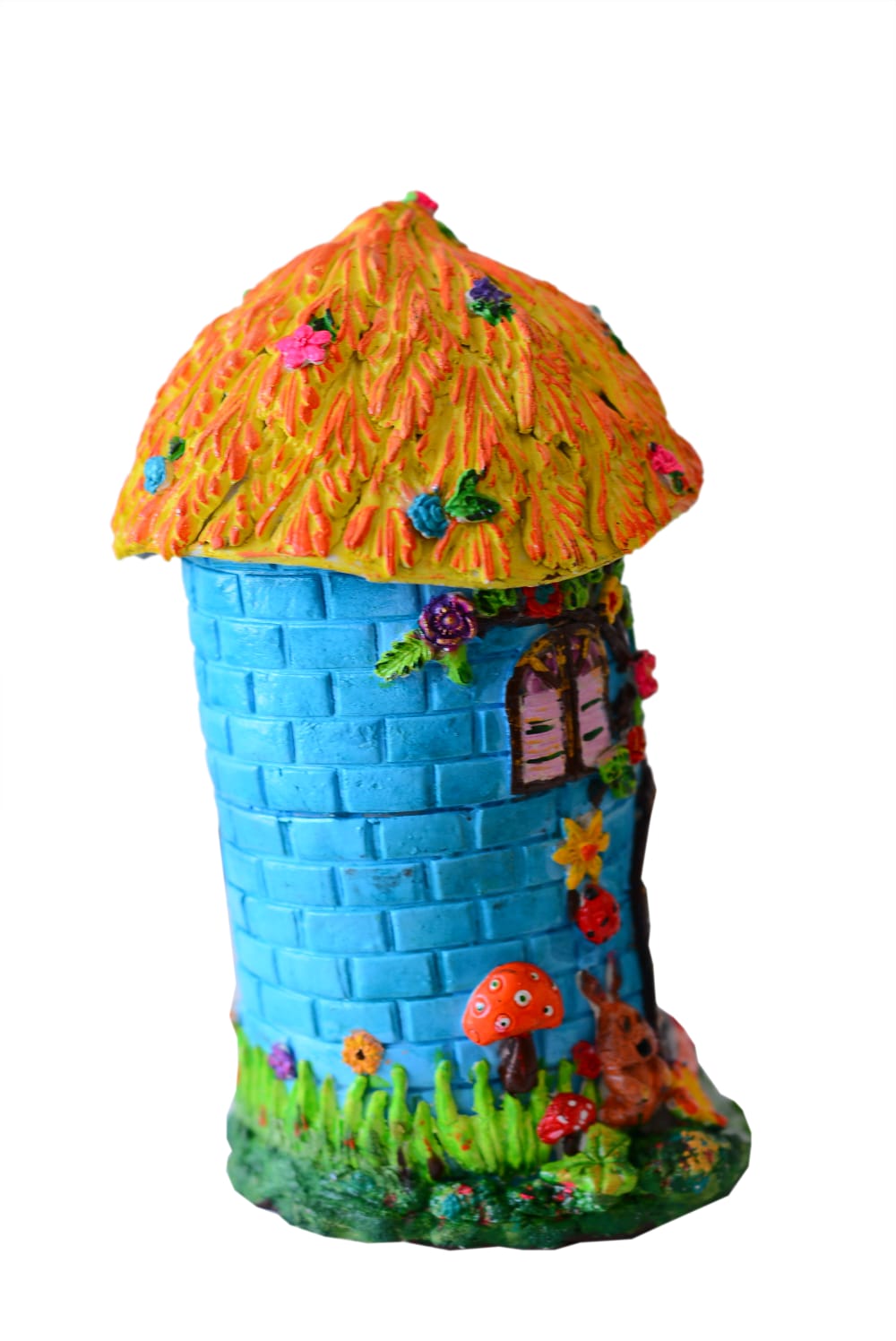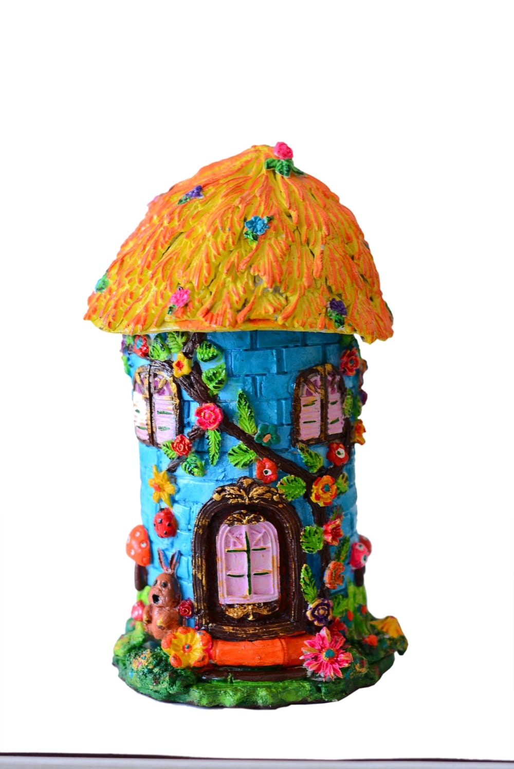 A vibrant fairy house with a bright blue stone-style body and a textured yellow-orange roof. Adorned with colorful flowers, leafy vines, and charming window details, it features a cute pink door and playful garden elements—perfect for adding a magical touch to any space.