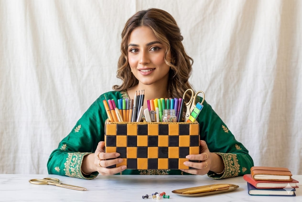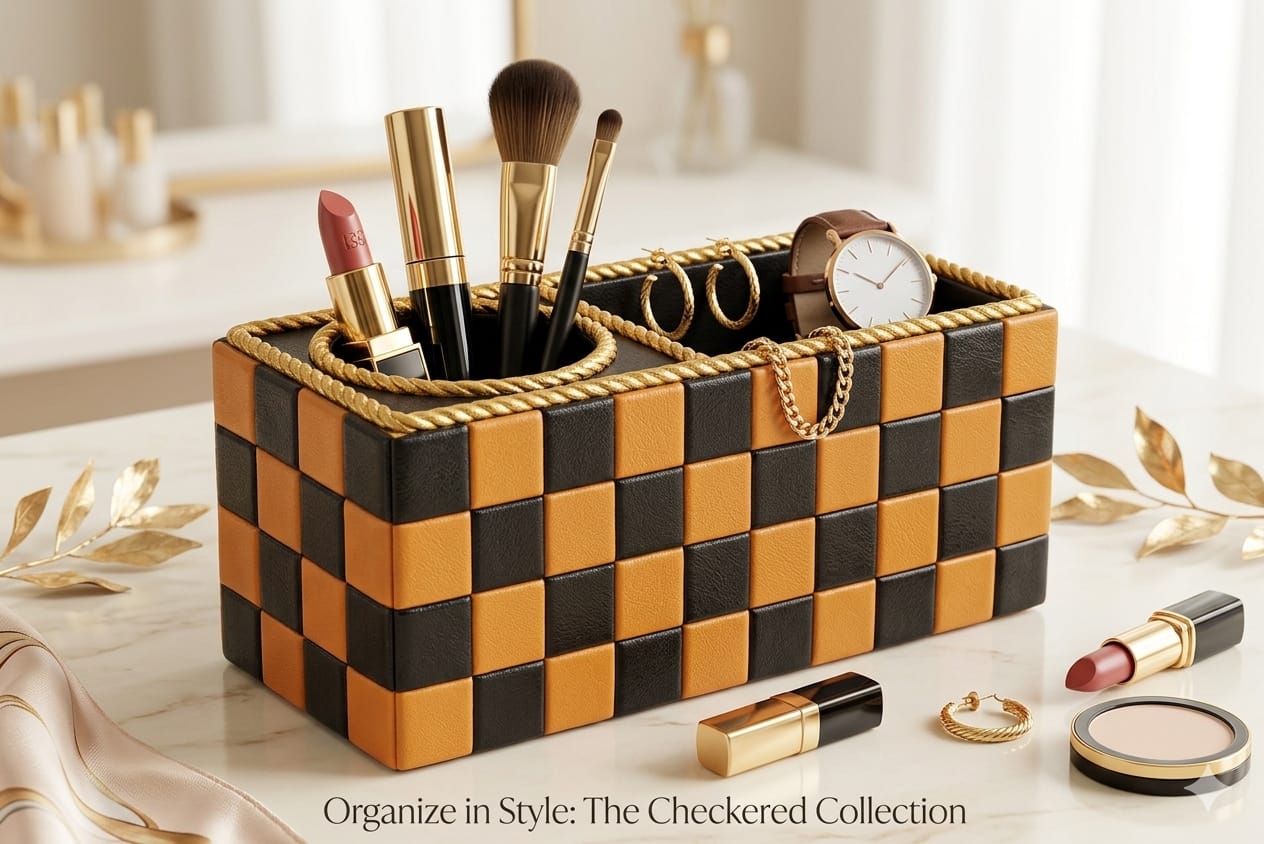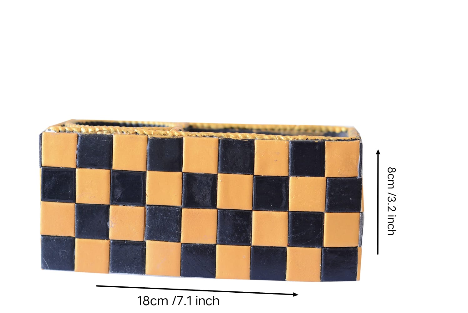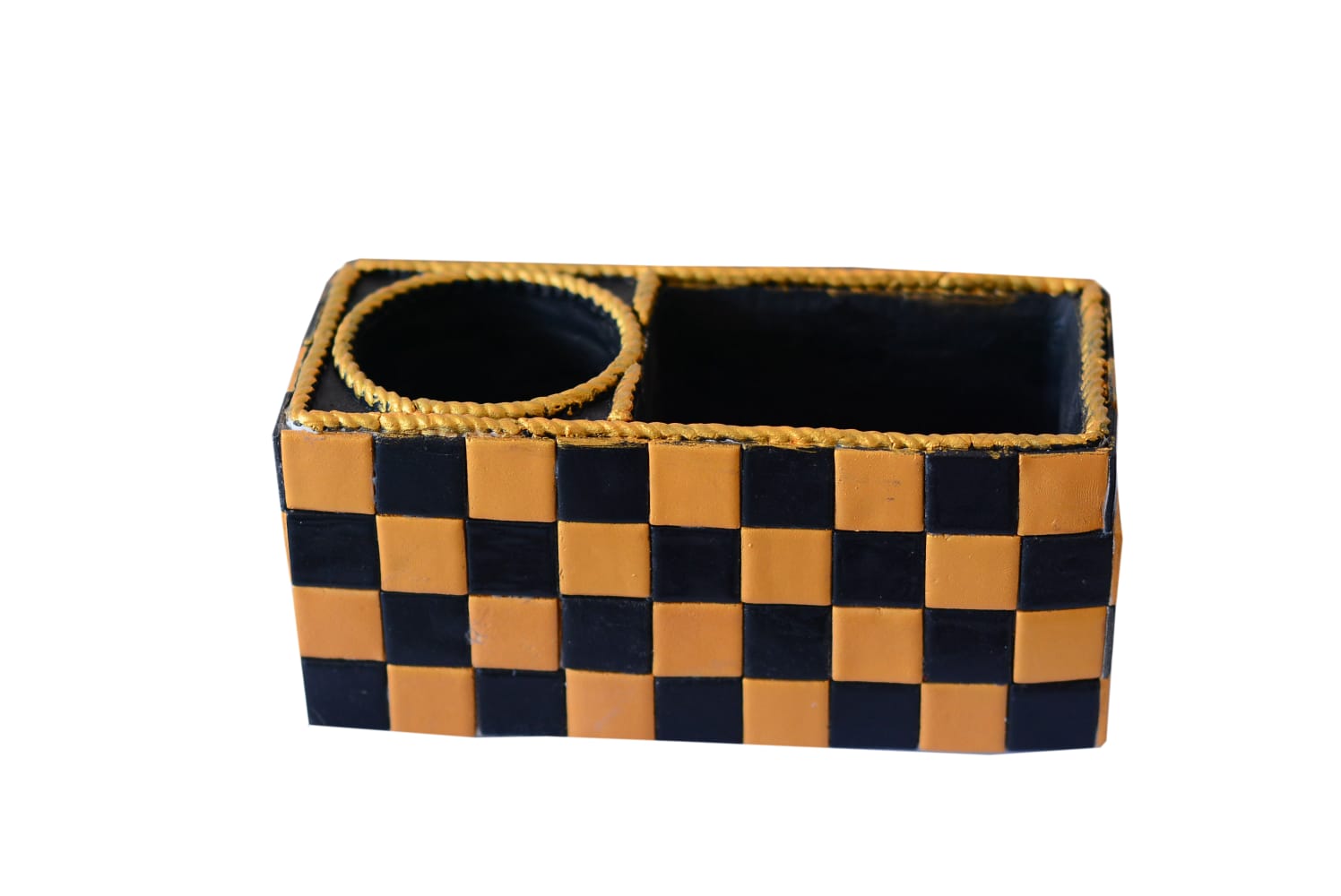 pen holder This handcrafted polymer clay desk organizer features a striking, high-contrast checkerboard pattern in matte black and vibrant amber gold. Meticulously assembled with individual clay tiles, this piece brings a bold, geometric aesthetic to any workspace.