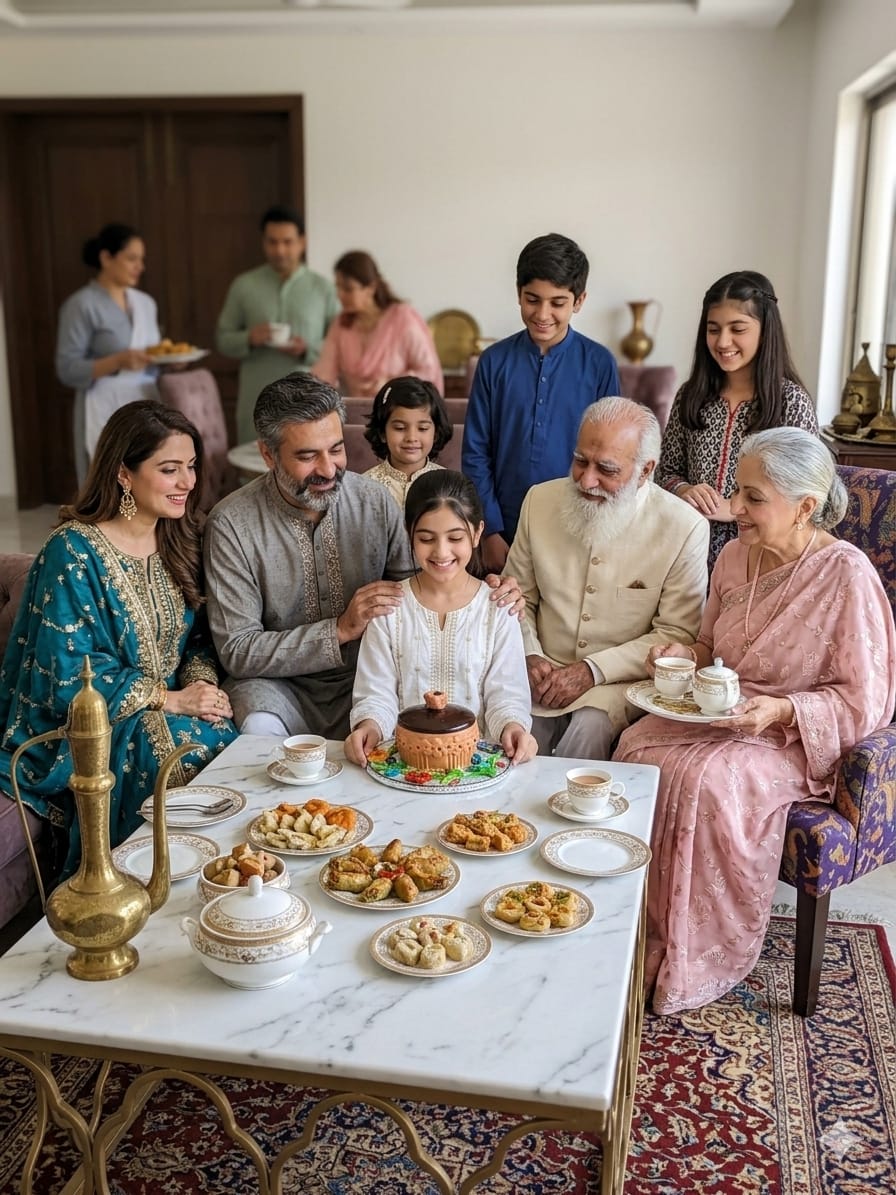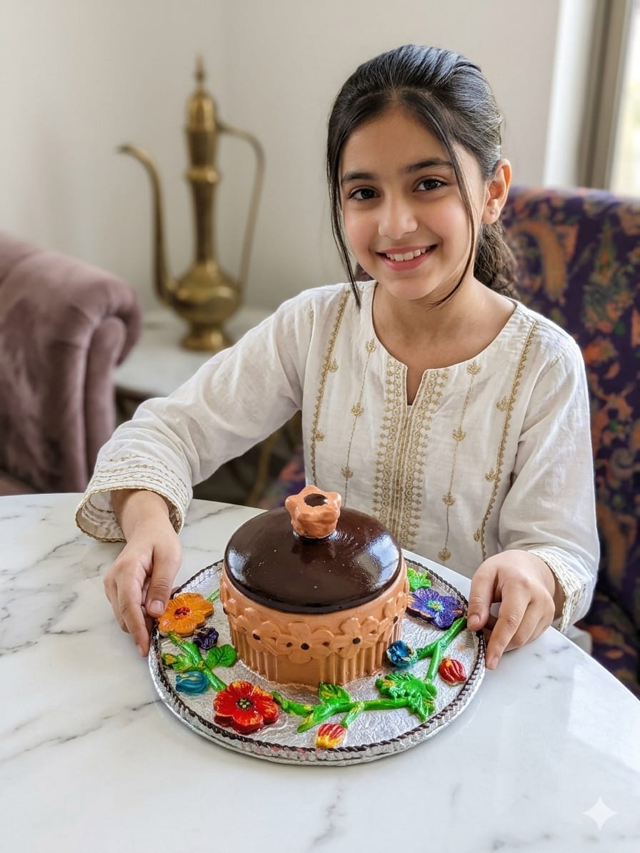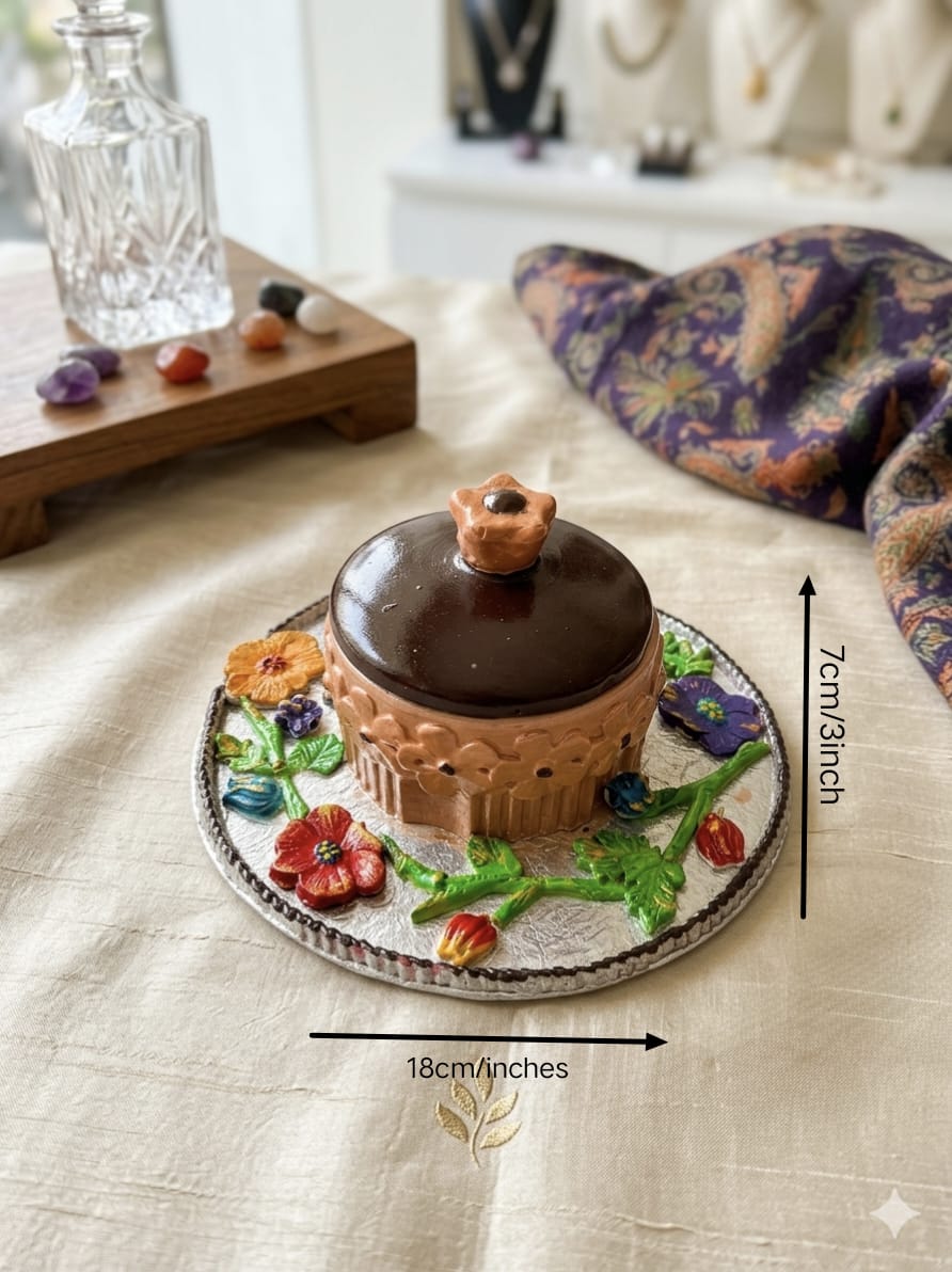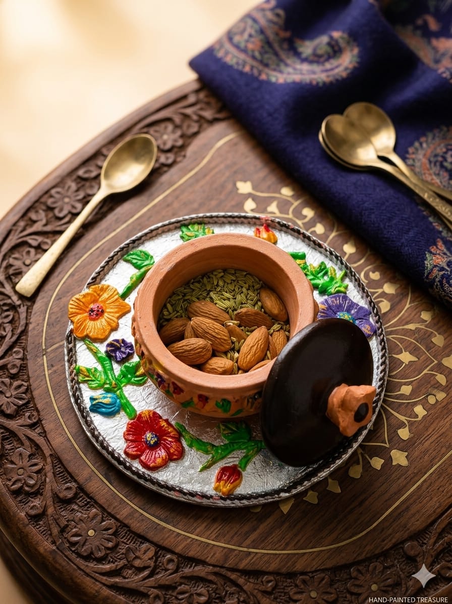 This image features a hand-painted terracotta pot filled with almonds and fennel seeds. It is presented on a decorative silver-toned floral plate, which sits atop an intricately carved wooden table. The scene is accented with brass spoons and a dark blue paisley-patterned fabric, creating a warm, traditional aesthetic.