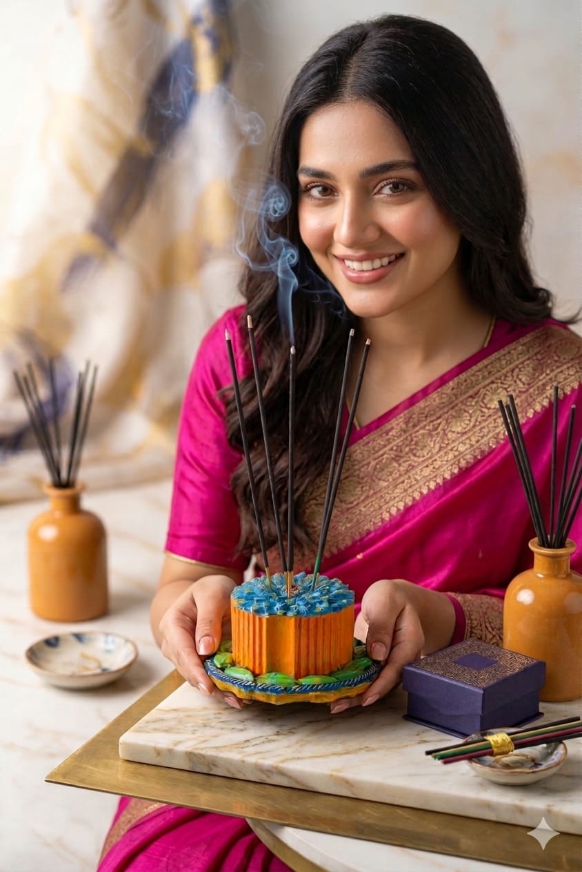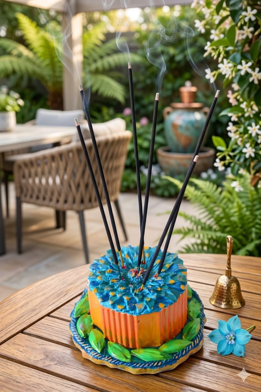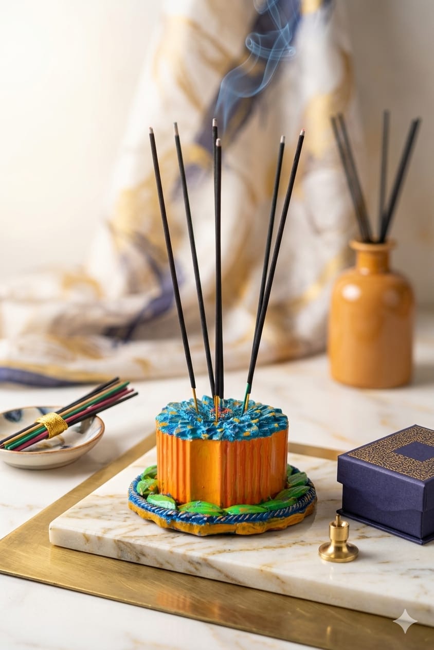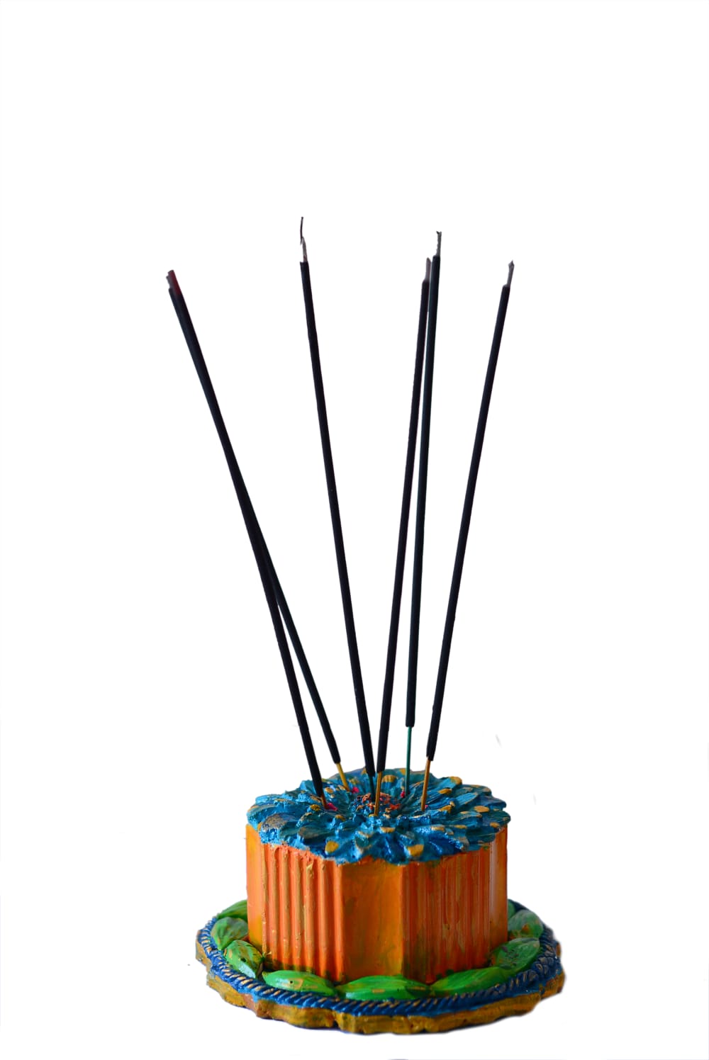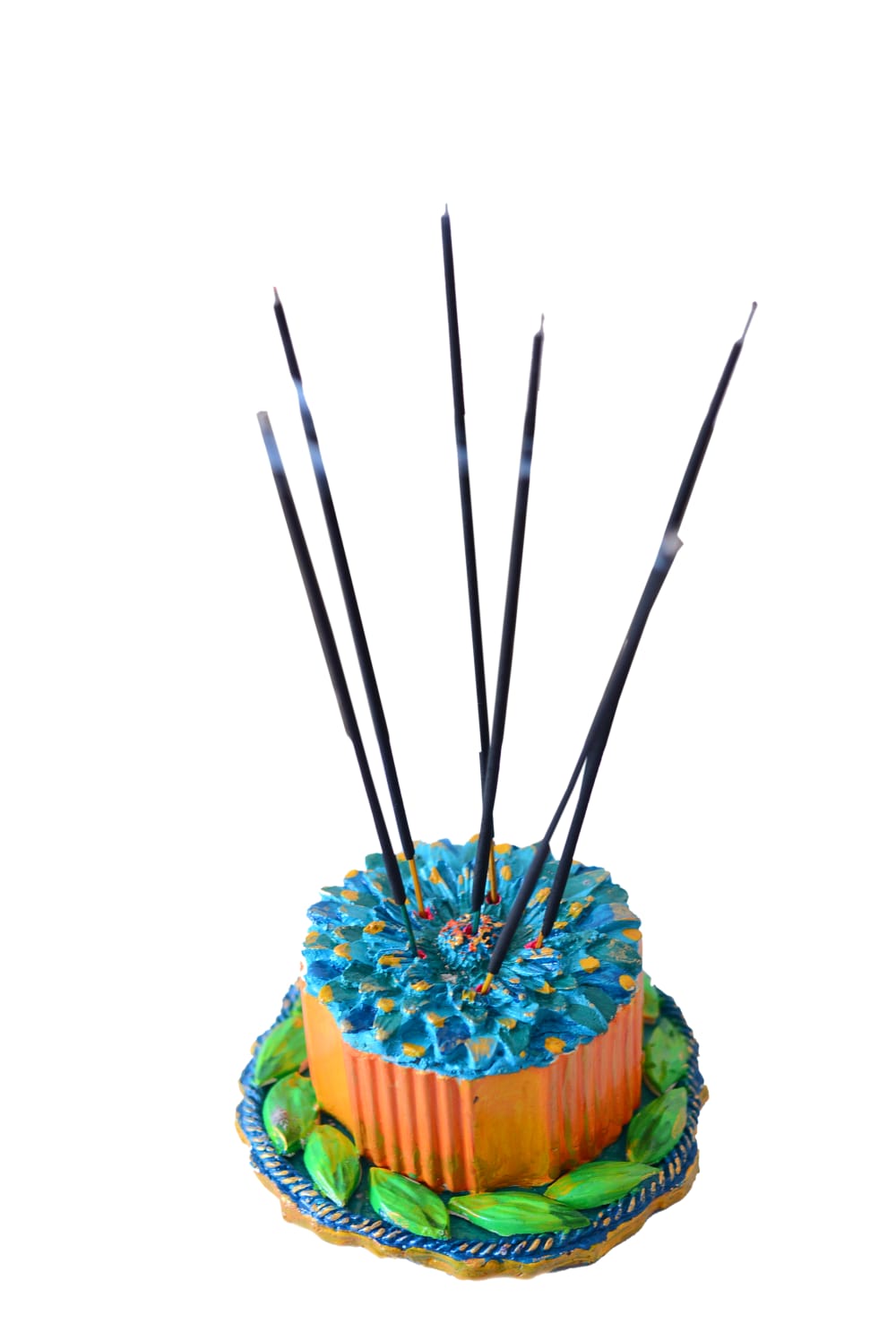 The top resembles a blooming flower with layered petals in shades of cerulean and turquoise, accented by golden-yellow highlights. It currently holds five dark incense sticks, fanning out from the center. The piece has a charming, folk-art aesthetic with visible brushstrokes and a rich, multi-colored palette.