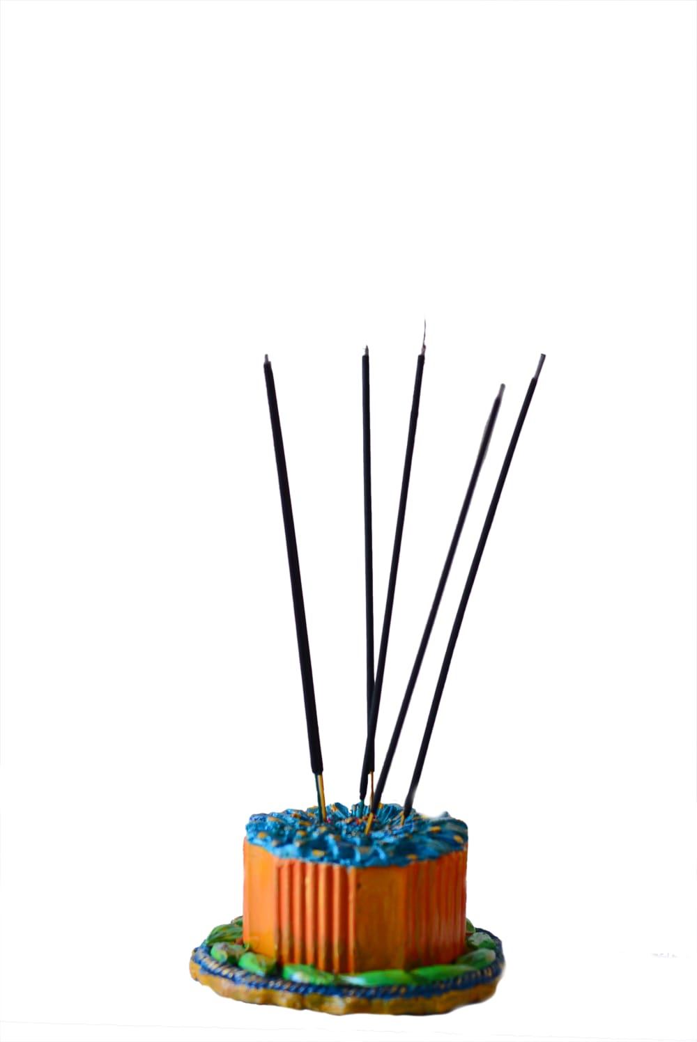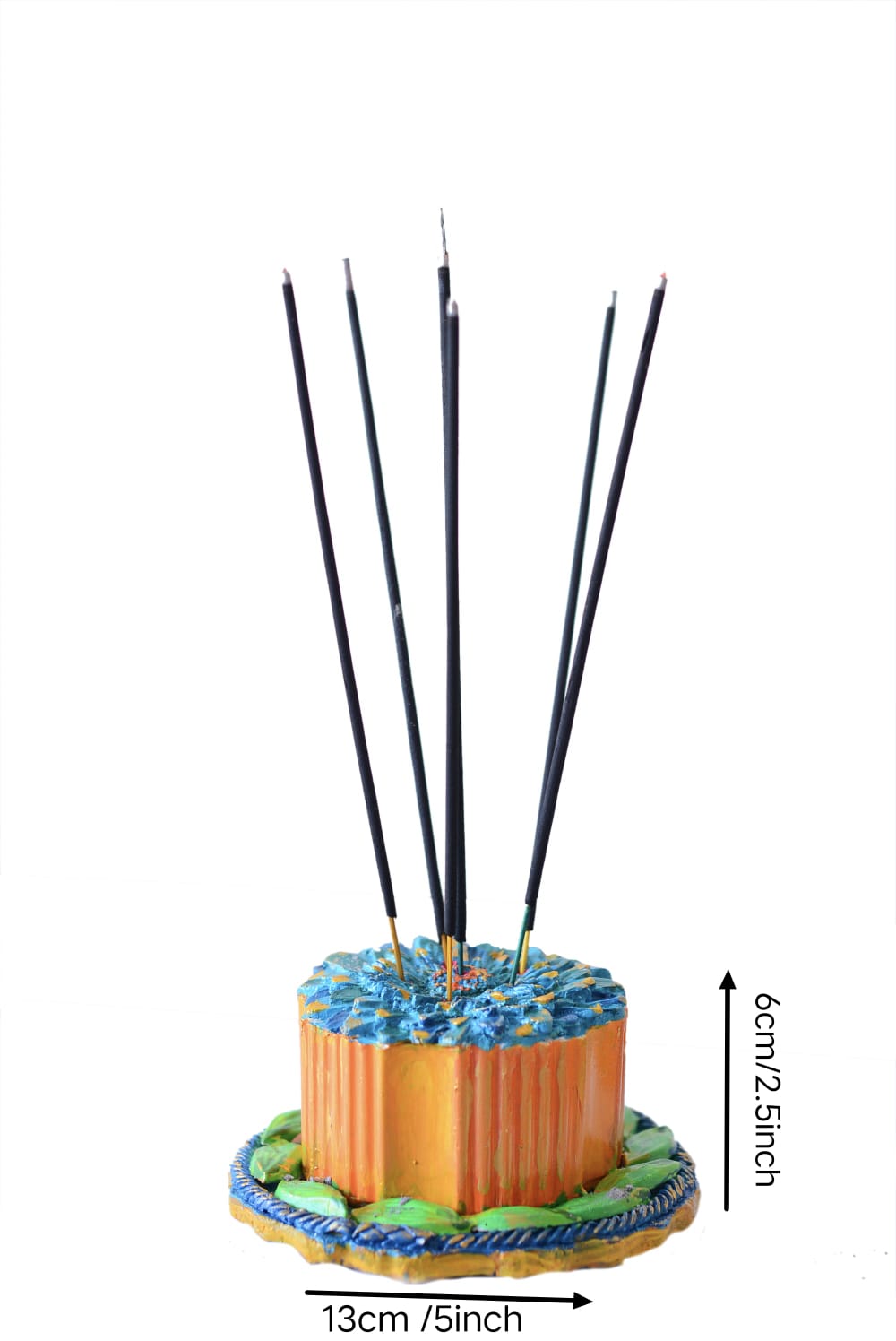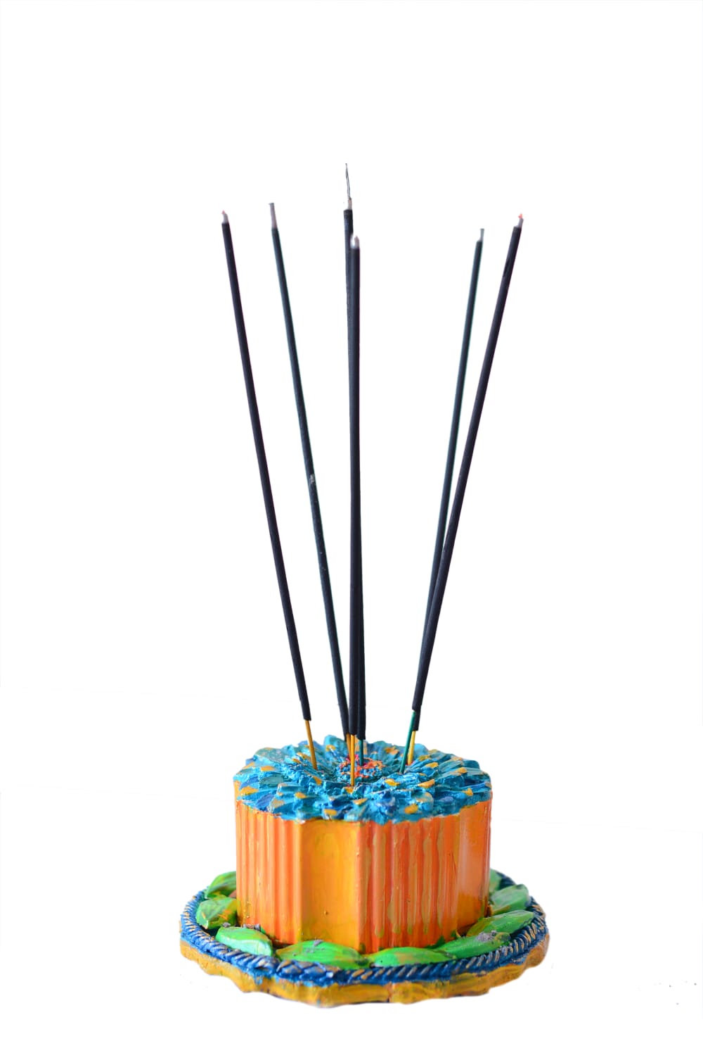 This is a vibrant, hand-painted incense holder featuring a whimsical, tiered design. The base is styled like a textured blue plate adorned with bright green leaf accents, supporting a central orange cylindrical body with vertical ridges.