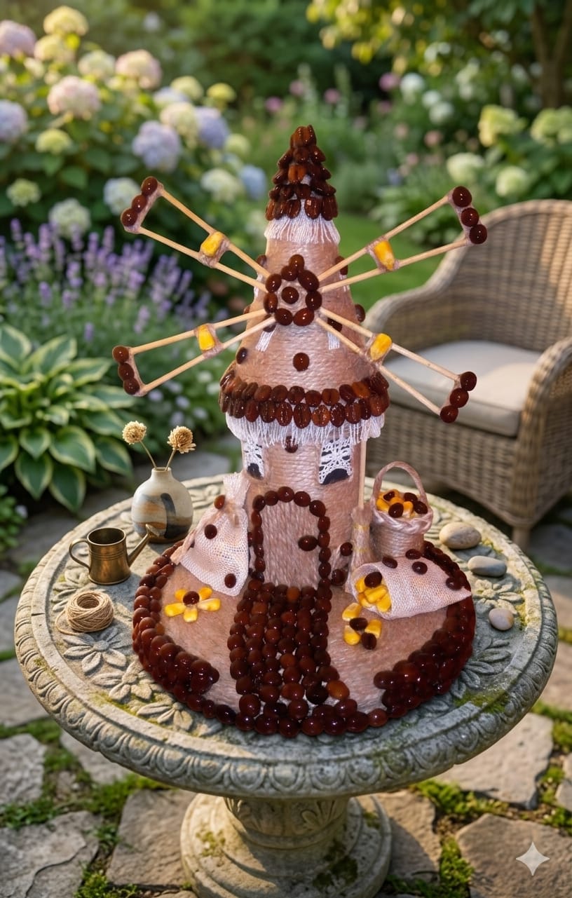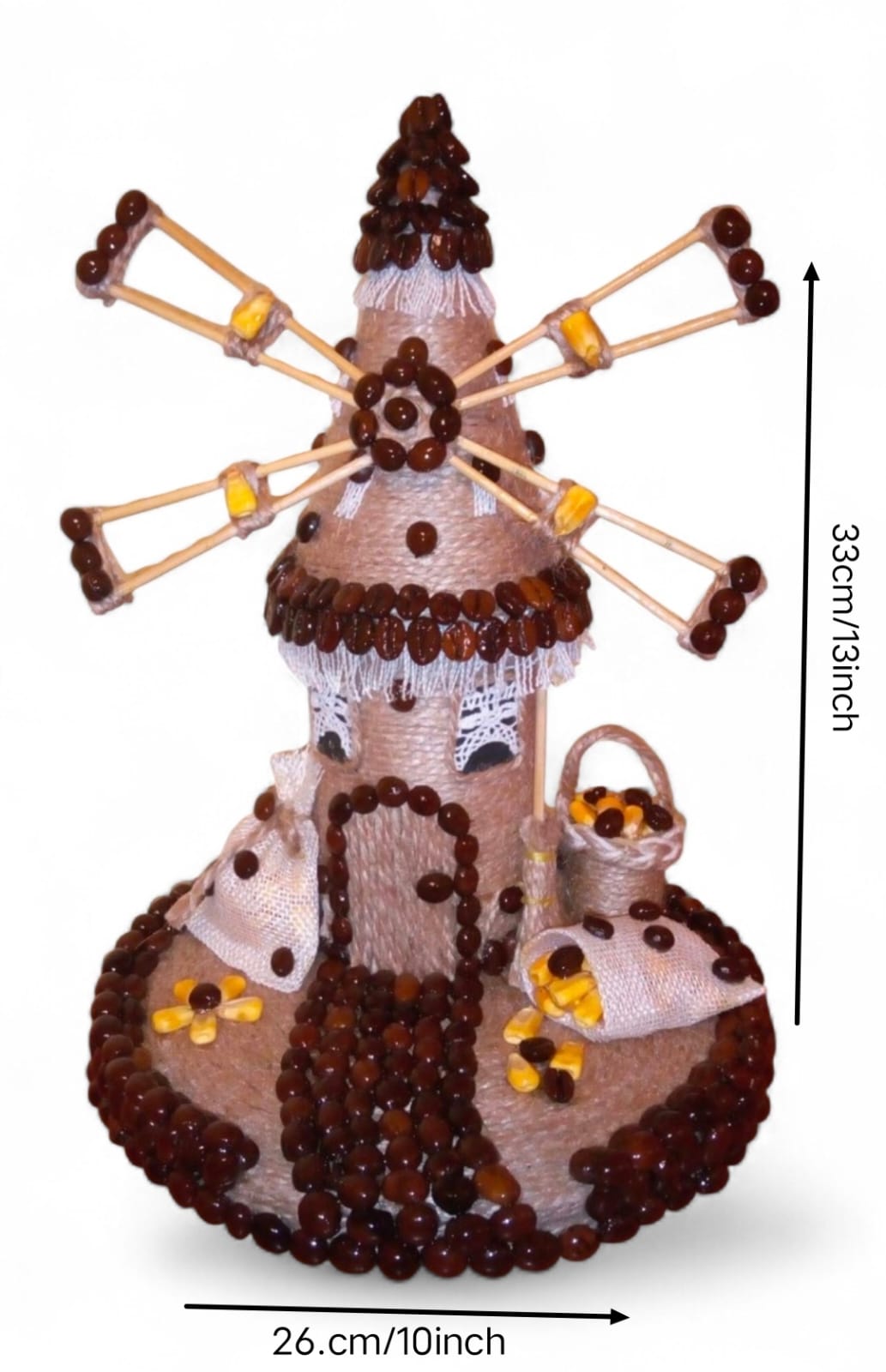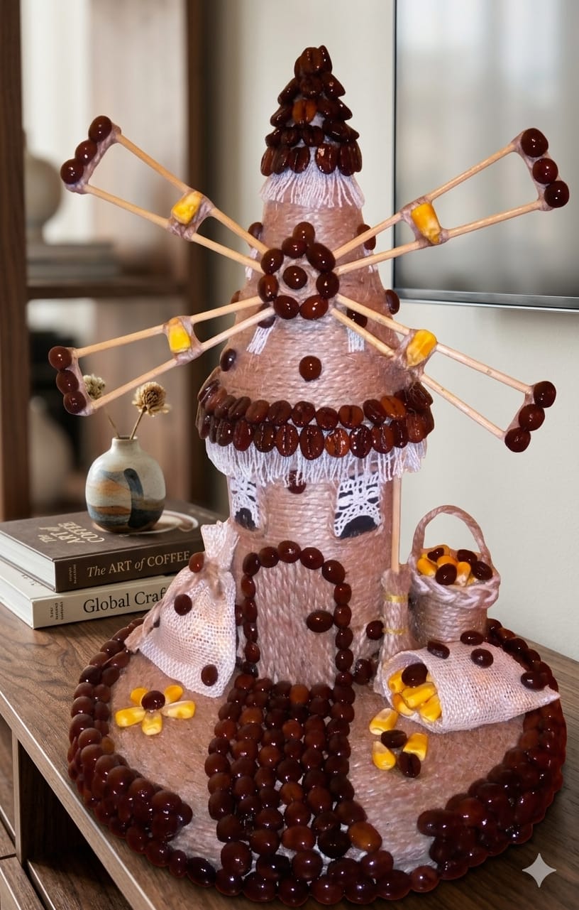 ​Decorative Accents: It is heavily embellished with roasted coffee beans, which outline the door, pathway, roof edges, and the tips of the windmill blades.