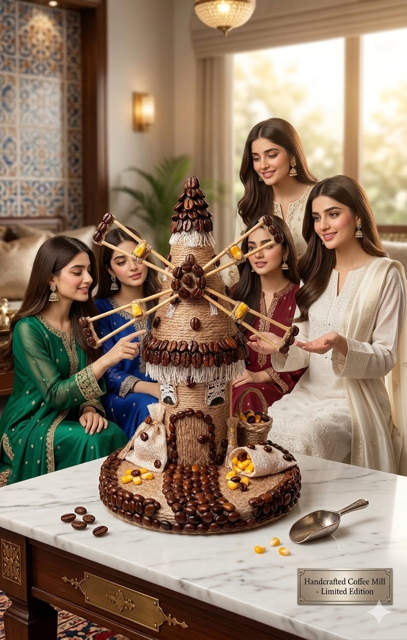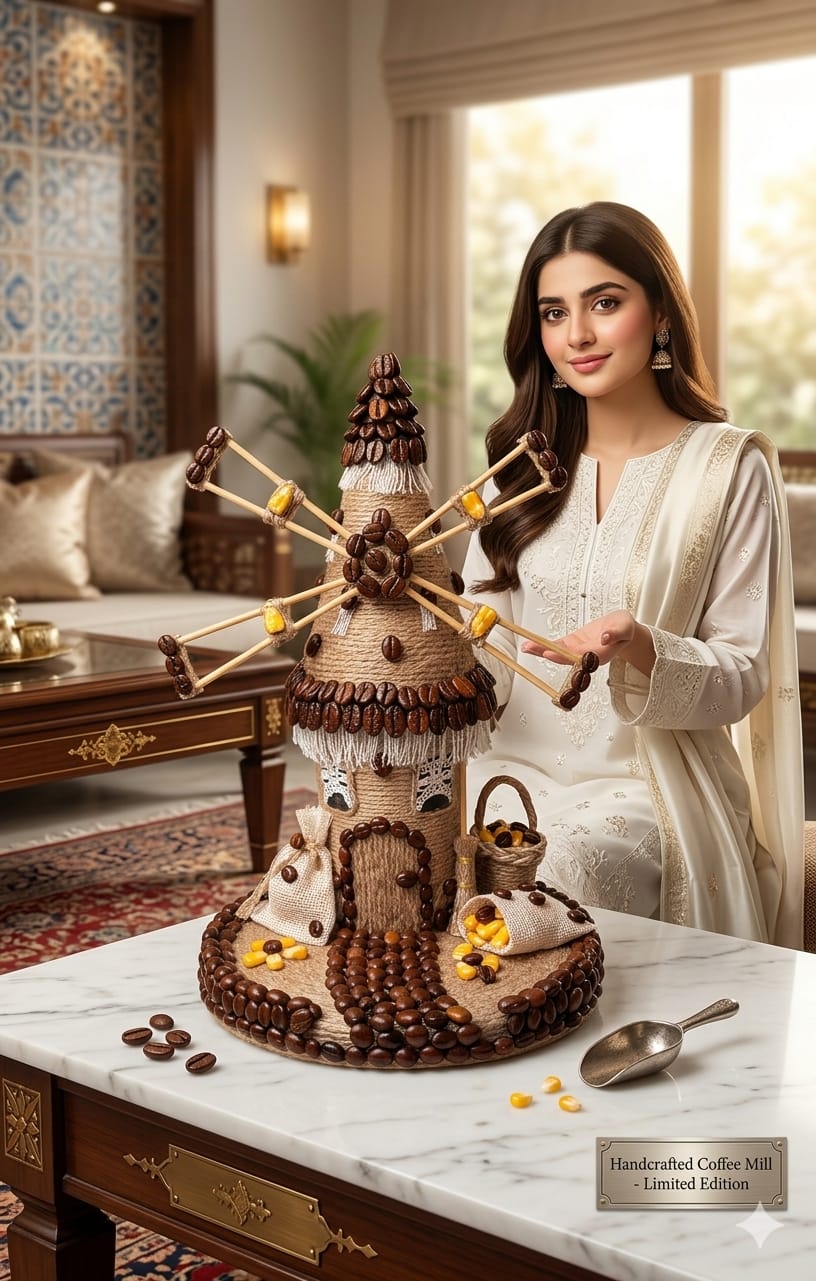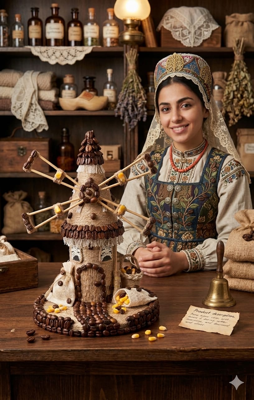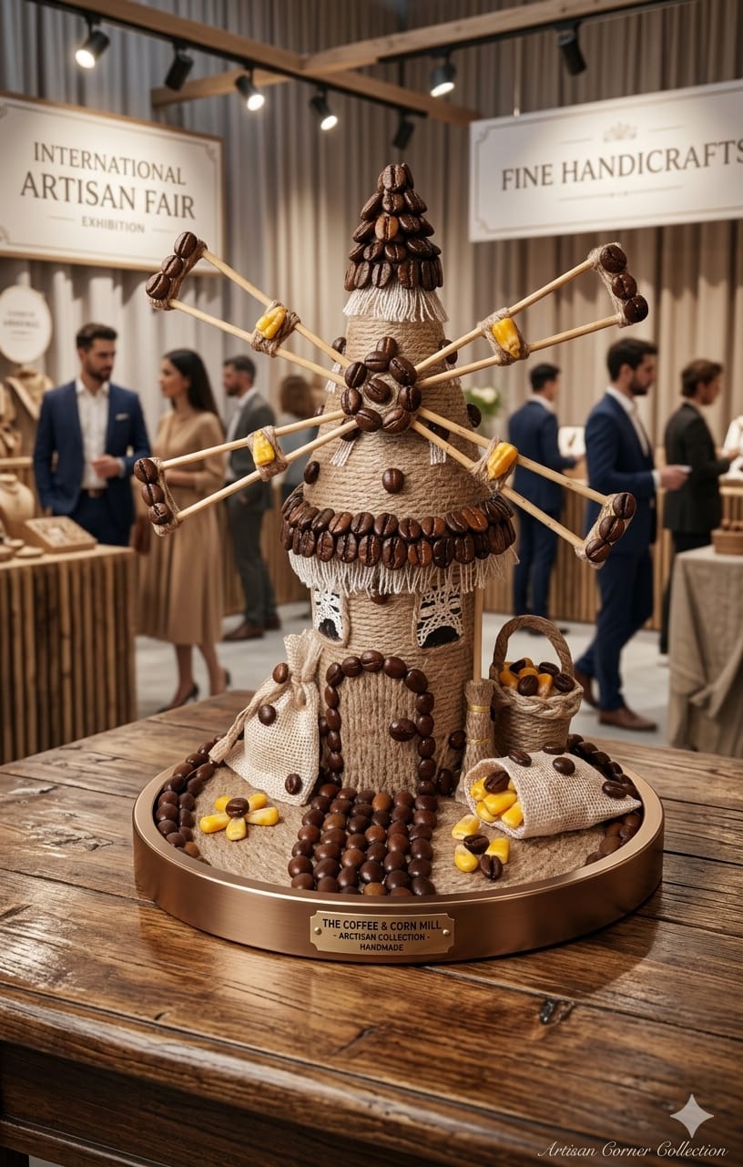 ​Decorative Accents: It is heavily embellished with roasted coffee beans, which outline the door, pathway, roof edges, and the tips of the windmill blades.