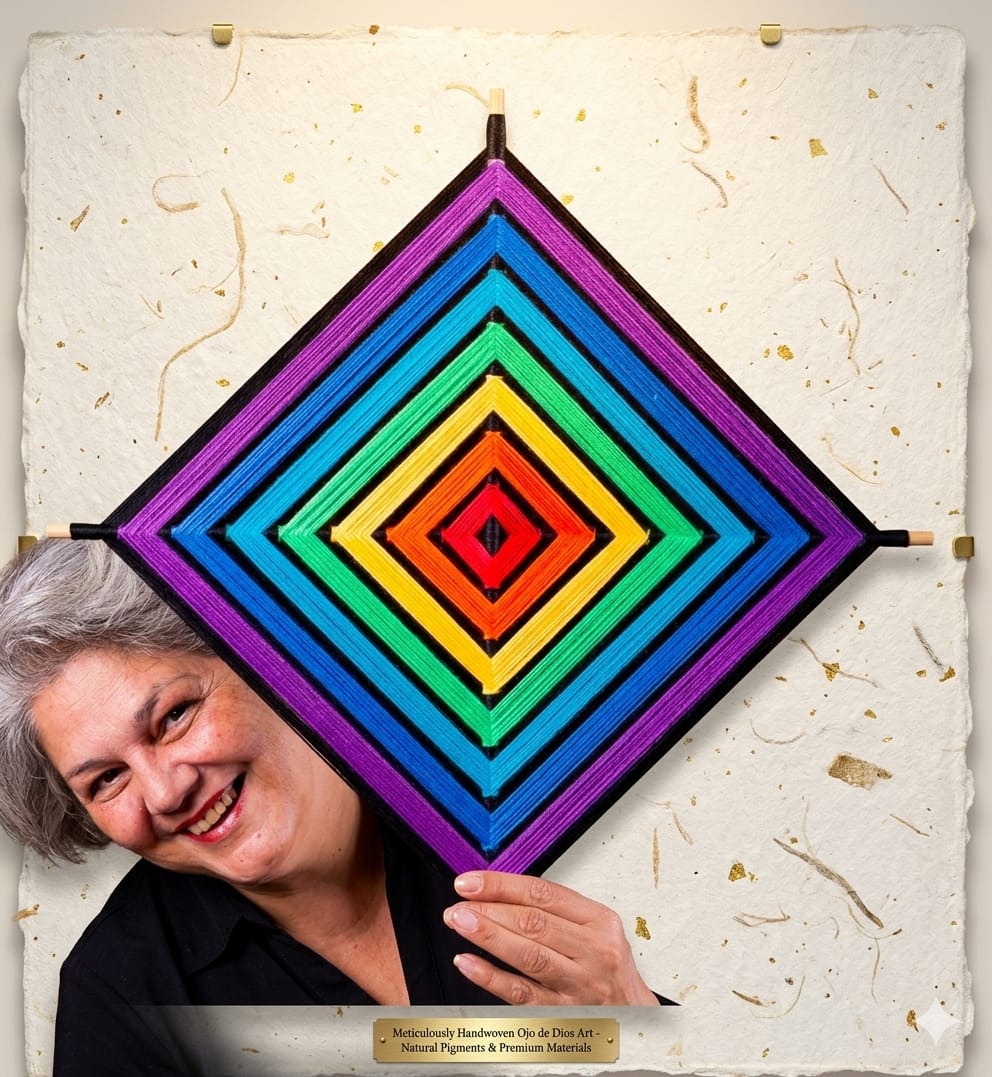 This vibrant Ojo de Dios (Eye of God) mandala is a stunning example of traditional yarn weaving. Featuring a bold, concentric diamond pattern, it transitions through a full spectrum of colors—from a deep red center out through orange, yellow, green, teal, and royal blue, all framed by a sharp purple and black border.